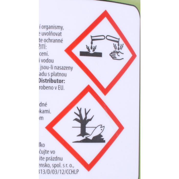 Spôsobuje ťažké poleptanie kože a poškodenie očí. Veľmi toxický pre vodné organizmy. Toxický pre vodné organizmy, s dlhodobými účinkami. Môže byť korozívna pre kovy. Pozor! Nepoužívajte spolu s inými výrobkami. Môžu sa uvoľňovať nebezpečné plyny (chlór). Uchovávajte mimo dosahu detí. Uchovávajte iba v pôvodnom balení. Používajte ochranné rukavice/ ochranný odev/ ochranné okuliare/ tvárový štít. Zabráňte uvoľneniu do životného prostredia.
