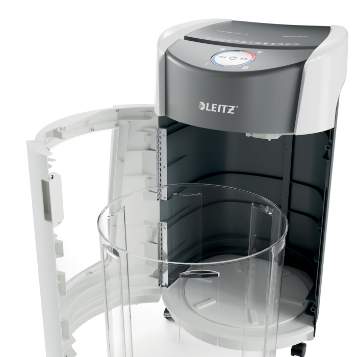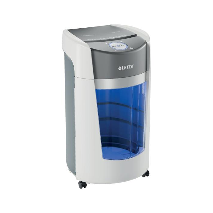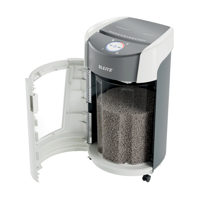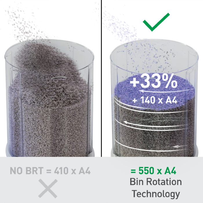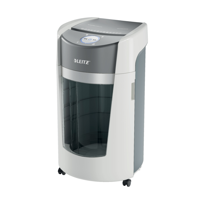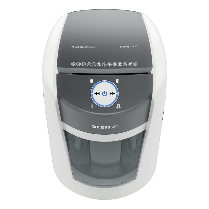Kancelárska skartovačka Leitz IQ OptiMax predstavuje inovatívne a štýlové riešenie skartovania, takže sa zároveň postará o výnimočnú bezpečnosť skartovania dokumentov a aj o váš pokoj. Táto skartovačka s vysokou bezpečnosťou skartovania dokumentov DIN P5 s mikrorezom bez námahy skartuje až 10 listov A4 naraz. Leitz IQ OptiMax disponuje jedinečnou technológiou rotačného koša (BRT), ktorá účinne maximalizuje kapacitu koša o +33 %*. Rotačný kôš zaobstaráva rovnomerné rozloženie papiera, zabraňuje nahromadeniu odrezkov papiera na jednom mieste. Vďaka tomu je možné skartovať ďalších 140 listov A4 do finálneho vysypania koša. Vďaka BRT (Bin Rotation Technology) netreba kôš vyberať ani pretriasať; indikátor plného koša sa aktivuje až vtedy, keď naplnenie koša dosiahne 100 % jeho kapacity. Veľkorysý kôš s objemom 35 l pojme až 550 listov A4, v priebehu skartovania svieti modro pre jednoduchú kontrolu chodu a estetický dojem.