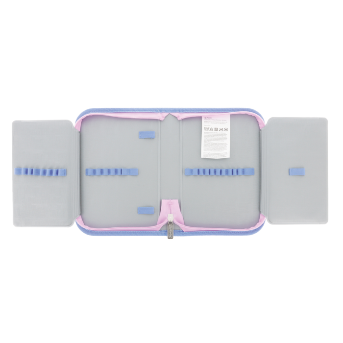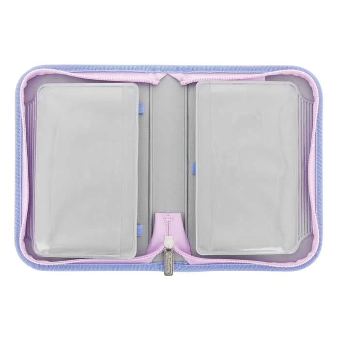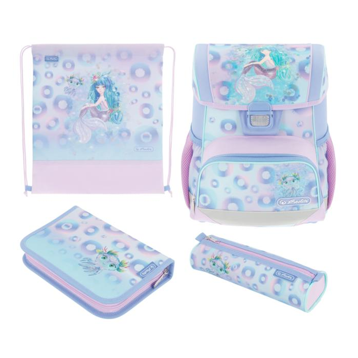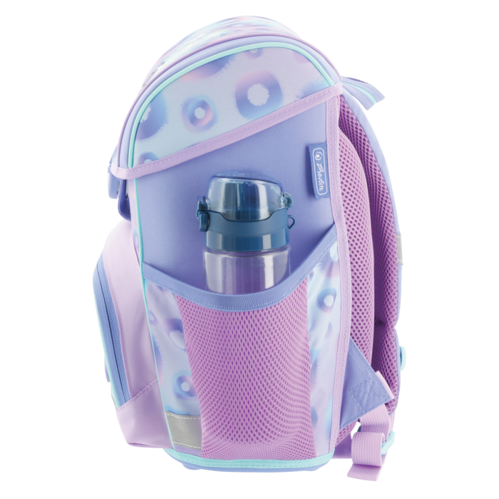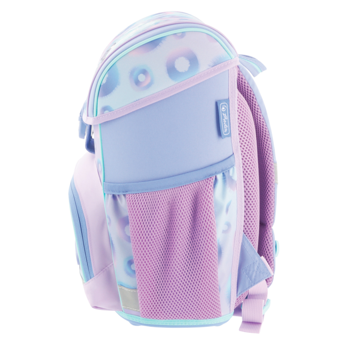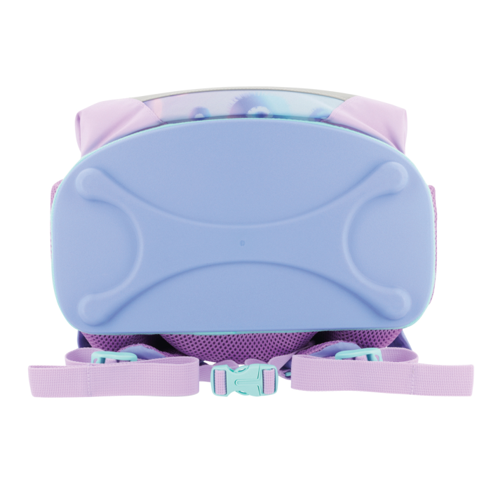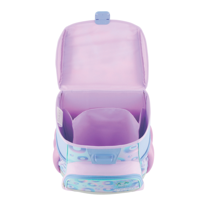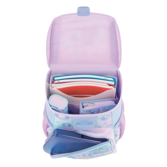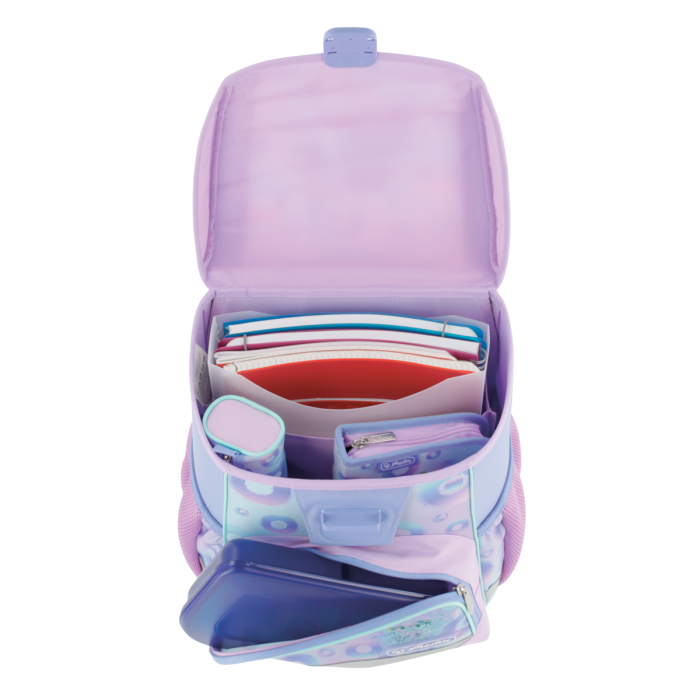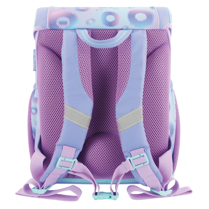 Školská taška s výbavou, ergonomicky tvarovaným a priedušným polstrovaním chrbta, nastaviteľnými ramennými popruhmi, výškovo nastaviteľným hrudným pásom, hlavným vreckom s priestorom na knihy, bočnými vreckami s elastickými pásikmi, predným vreckom na zips, stabilnou spodnou doskou s nožičkami, pohodlnou rukoväťou a reflexnými prvkami Oralite. Hmotnosť 950 g, objem 16 l, rozmery 37 x 31 x 22 cm. Vode-odolná, bez PVC, výbava: peračník, vrecko na prezuvky, okrúhle puzdro. Certifikát ergonómie 2023 a 2025. Materiál: polyester.