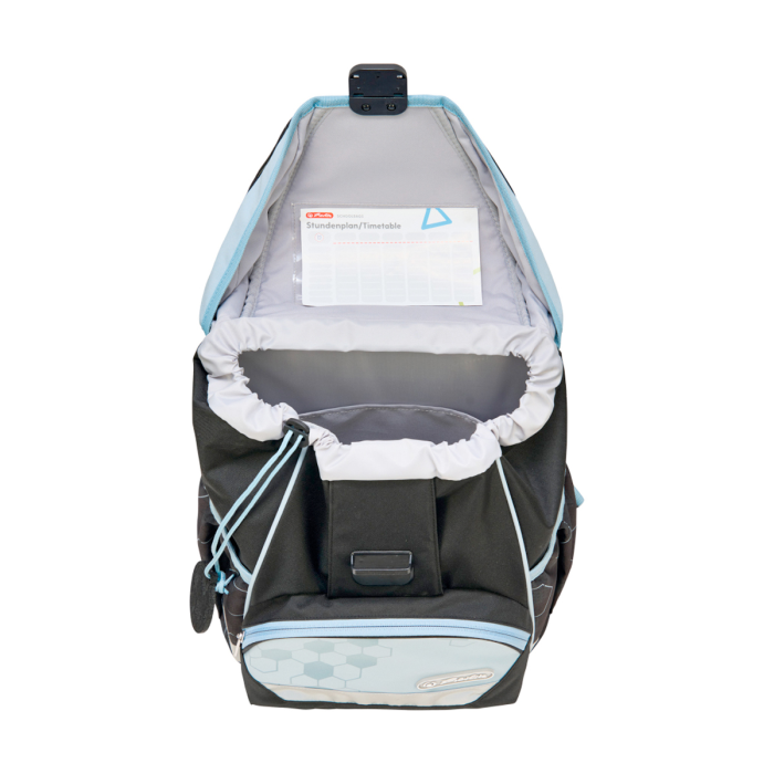 Školská taška s výbavou, s anatomicky tvarovaným polstrovaným a priedušným chrbtom, nastaviteľnými ramennými popruhmi, predným vreckom na zips, dvomi bočnými vreckami s elastickými pásikmi, stabilnou spodná doskou s nožičkami, pohodlnou rukoväťou, reflexnými prvkami Oralite, zatváranie Click lock zips, 1 x odnímateľný odznačik na suchý zips, 1 x dekoratívny prvok. Hmotnosť 800 g, objem 22 l, rozmery: 39 x 32 x 25 cm. Vode-odolná, bez PVC, výbava: peračník prázdny 2 chlopne, vrecko na prezuvky, oválne puzdro.