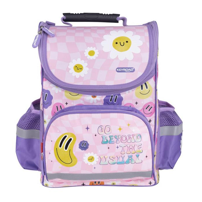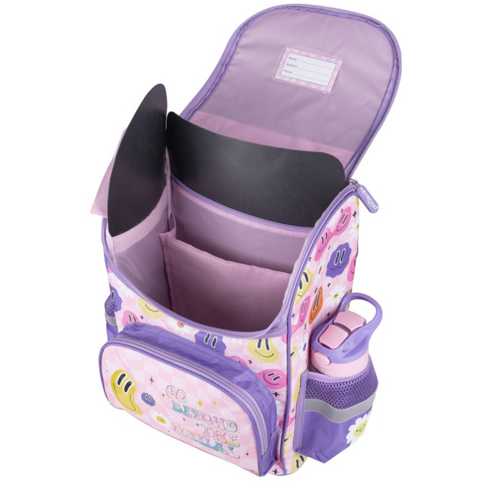 Extrémne ľahká školská taška prispôsobená veku a hmotnosti dieťaťa, čo znamená, že dodatočne nezaťažuje chrbticu a kĺby. Vhodná pre žiakov 1. - 2. ročníka ZŠ. Profilovaná a vystužená konštrukcia pomáha udržiavať správne držanie tela. Vstavané ventilačné kanáliky zaisťujú dostatočné prúdenie vzduchu, takže batoh neprehrieva chrbát dieťaťa. Široké a mäkké popruhy s nastaviteľnou dĺžkou zvyšujú komfort, nezaťažujú ramená a umožňujú prispôsobenie školskej tašky výške dieťaťa. S hrudným popruhom spájajúcim ramenné popruhy, ktorý zabraňuje skĺznutiu z pliec a odľahčuje chrbát. Dodatočný stabilizačný panel chrániaci bedrovú časť. Pogumovaná rukoväť a uzamykacie gombíky umožňujú ľahké a pohodlné držanie. Vybavená funkčnou hlavnou priehradkou s dodatočnou priehradkou, ktorá uľahčuje organizáciu a rýchly prístup k potrebným veciam. Má ďalšie vonkajšie vrecko na zips a dve bočné, elastické vonkajšie vrecká na nápoje alebo iné drobnosti. Rozmery: 38 x 28 x 18 cm. Vzor: úsmev.