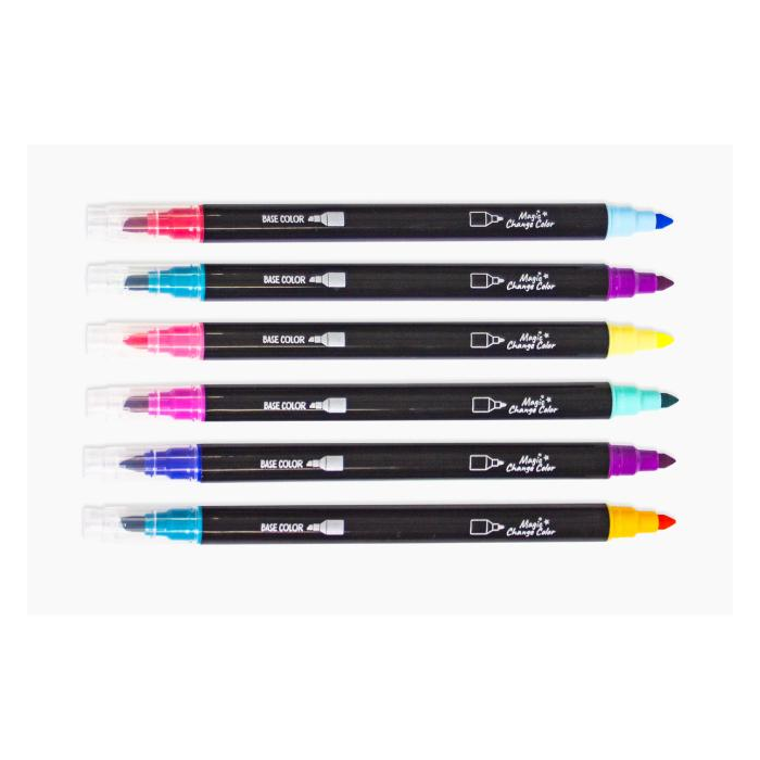 Zvýrazňovač s funkciou zmeny farby. Obojstranný zvýrazňovač s hrotom v tvare sekáča (základná farba) a okrúhlym hrotom (magická farba). Najprv zvýraznite text základnou farbou (hrot v tvare sekáča) a nechajte ho krátko zaschnúť. Potom zvýraznite jednotlivé slová druhým hrotom; farba sa magicky zmení. 6 rôznych farieb. Dĺžka pera 16,4 cm, vetrané uzávery. Šírka čiary hrotom v tvare sekáča 1 - 4 mm. Balené v puzdre s pútkom na zavesenie v európskom štýle.