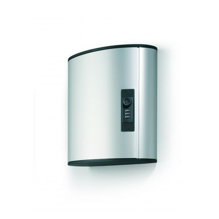 Skrinka na kľúče so zámkom na číselný kód, s dvierkami, otvárajúcimi sa z dôvodu lepšej obsluhy v 180° uhle a vrchným otvorom na odovzdanie kľúča bez nutnosti otvorenia skrinky. Kapacita 54 kľúčov. Jednoduchá montáž na stenu. Súčasťou balenia je montážna sada a 6 menoviek na kľúče v rôznych farbách. Farba strieborná.