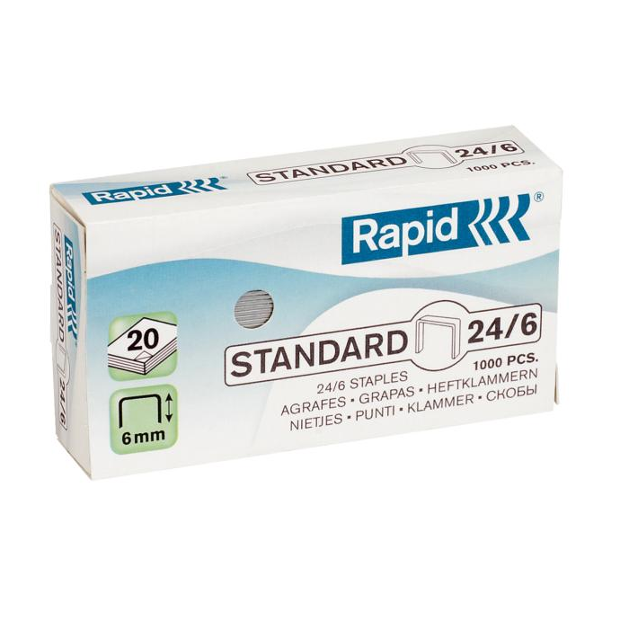 Zošívací výkon až 20 listov (80 g/m2). Krabička obsahuje: 1.000 spiniek. Rozlišovací systém typov spiniek pomocou farieb (STANDARD = Zelená). Dĺžka nožičky spinky 6 mm. Galvanizovaný mäkký drát pre maximálne pohodlné používanie. Ostré konce pre maximálnu penetráciu.