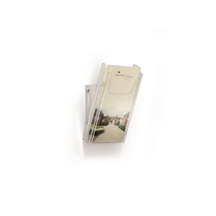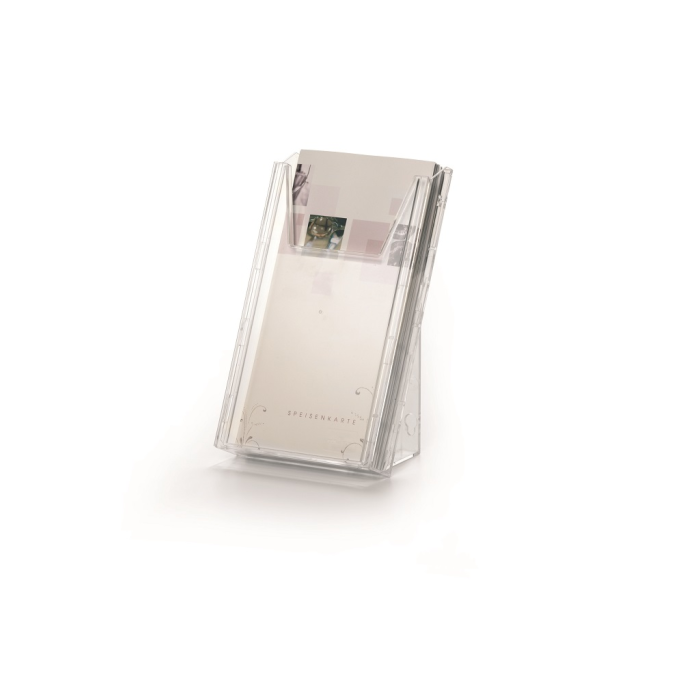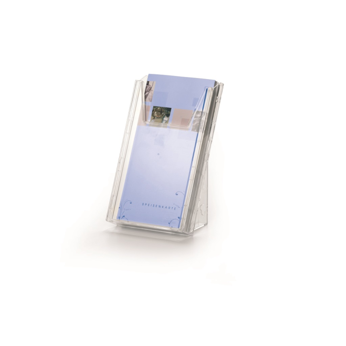 Kombinovaný stojan na prospekty a časopisy formátu DL a A6 s jedným odkladačom a závesným dielom na stenu, resp. stôl. Naplnenie materiálmi do hrúbky 24 mm. Materiál priehľadný plast.