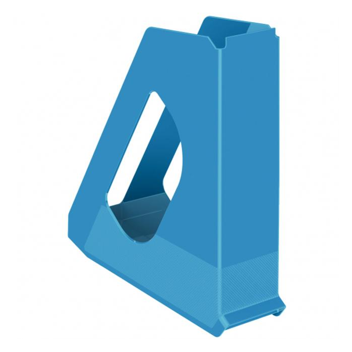 Moderný stojan na časopisy pre uloženie dokumentov formátu A4 na pracovnom stole s unikátnym embosovaným povrchom (štvorčeky) na dne stojana vo sviežich farbách radu Esselte VIVIDA. Znížený chrbát pre jasnú identifikáciu obsahu z prednej strany, integrovaný úchyt pre ľahké vytiahnutie z police. Farba modrá. Rozmery (š x v x h) 72 x 256 x 260 mm. Je možné kombinovať ho s ostatnými výrobkami z radu Esselte Europost a VIVIDA pre jednotný vzhľad kancelárie.