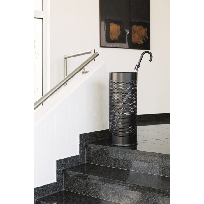 Štýlový stojan na dáždniky vysokej kvality s dekoratívnou perforáciou vyrobený z ocele. Ideálny do vstupných priestorov, domácností a kancelárií. Objem 28,5 l, výška 620 mm, priemer 260 mm.