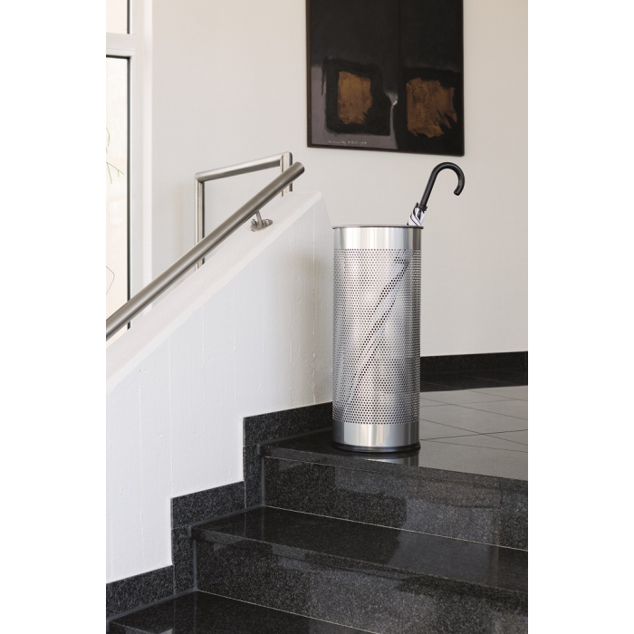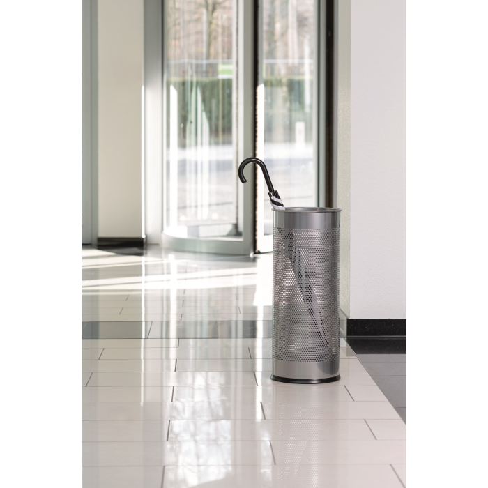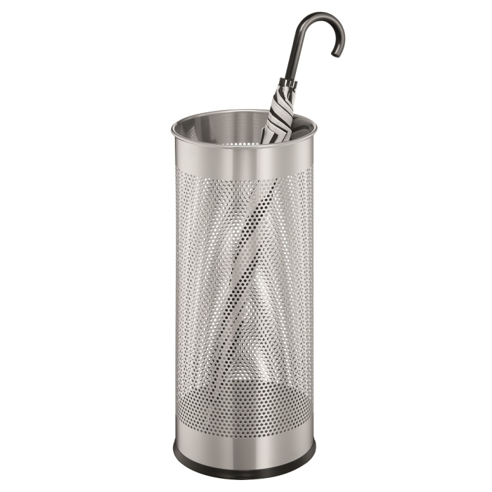 Štýlový stojan na dáždniky vysokej kvality s dekoratívnou perforáciou vyrobený z ocele. Ideálny do vstupných priestorov, domácností a kancelárií. Objem 28,5 l, výška 620 mm, priemer 260 mm.