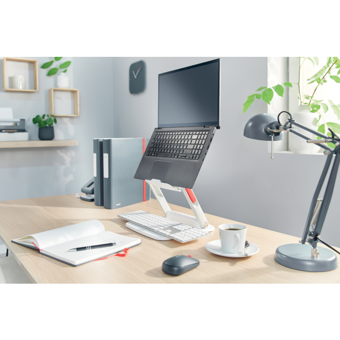 Viacuhlý stojan na notebook Leitz Ergo dvíha obrazovku notebooku do ideálnej ergonomickej výšky, čím zvyšuje pohodlie pri sledovaní a pomáha zlepšiť držanie tela. Rôzne kombinácie výšky a uhla vrátane horizontálneho nastavenia s malými rozmermi pre kompaktné stoly. Použitie stojana pod notebook tiež podporuje prúdenie vzduchu, čím sa zabraňuje prehrievaniu batérie notebooku a ďalších komponentov a notebook si tak udržuje vysokú úroveň výkonu.