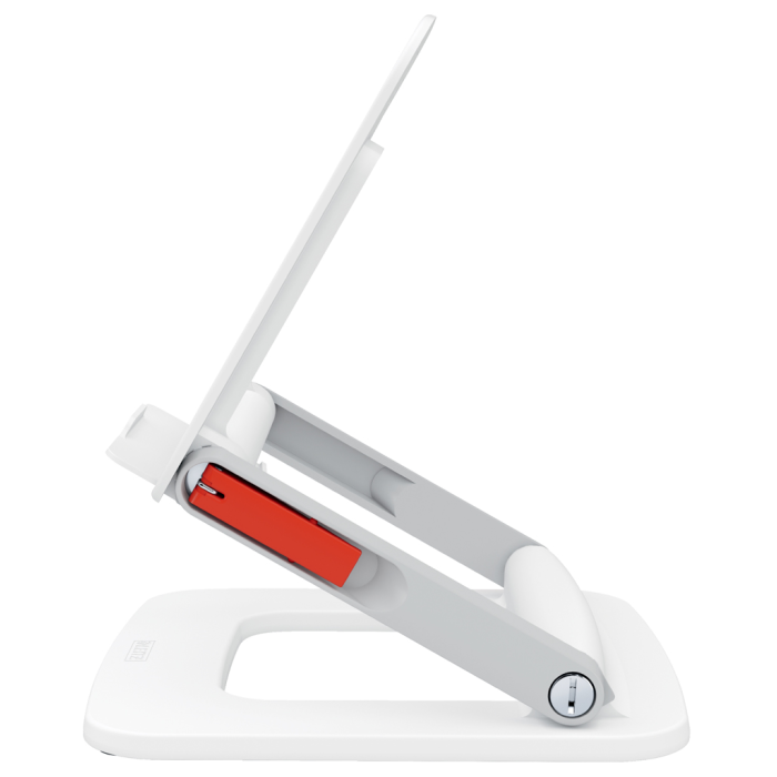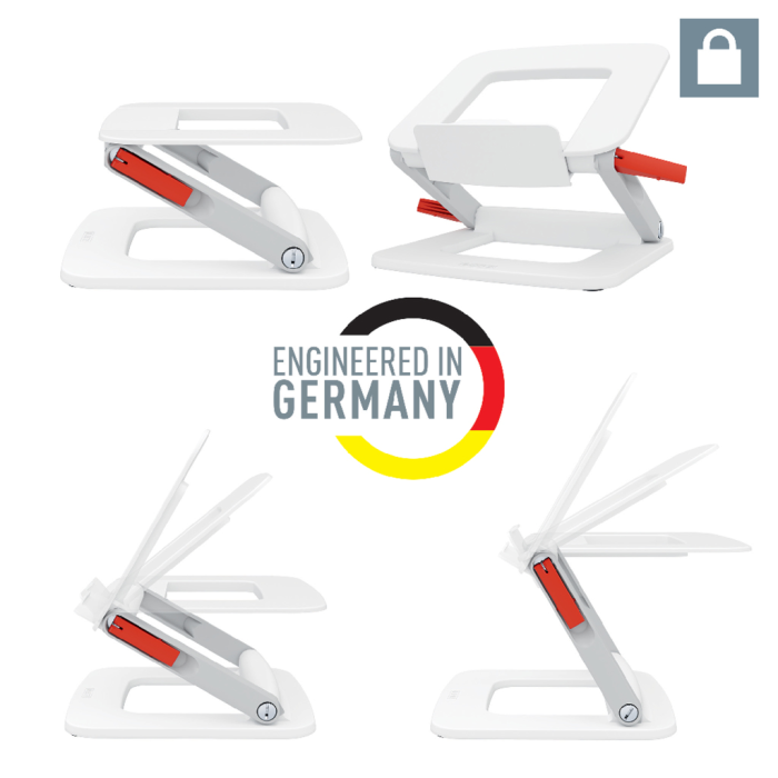 Vždy dokonale horizontálne vyrovnané vďaka šesť bezpečným prednastaveným kombináciám výšky a uhla (na rozdiel od väčšiny kovových riešení). Integrovaný háčik zaisťuje bezpečné a stabilné uchopenie, sklopenie háčika pre bezpečné použitie v horizontálnej polohe notebooku alebo pri uložení na plocho, gumové nožičky zabraňujú kĺzaniu stojana po stole. Jednoduché nastavenie výšky, bezpečné nastavenie výšky vďaka 2 ramenám. Vhodné pre notebooky a Macbooky od 13` do 15`. Hmotnosť 0,74 kg.