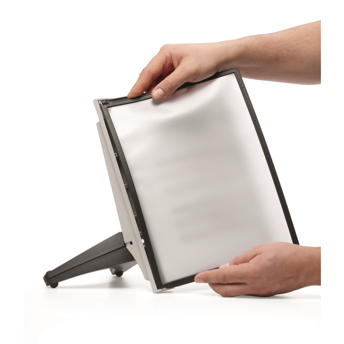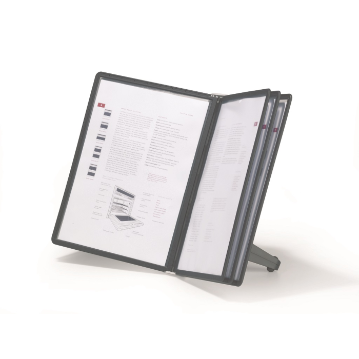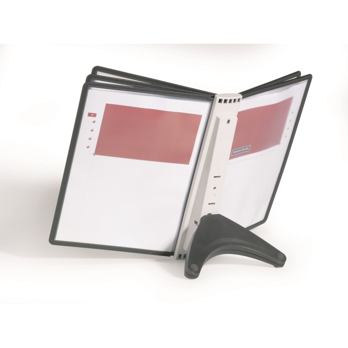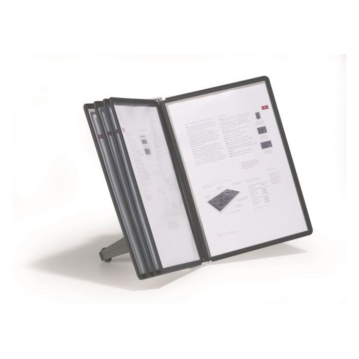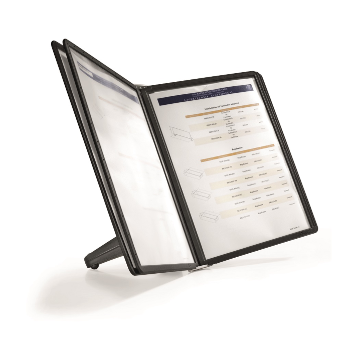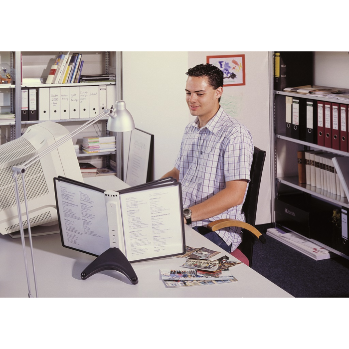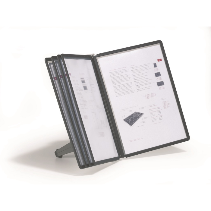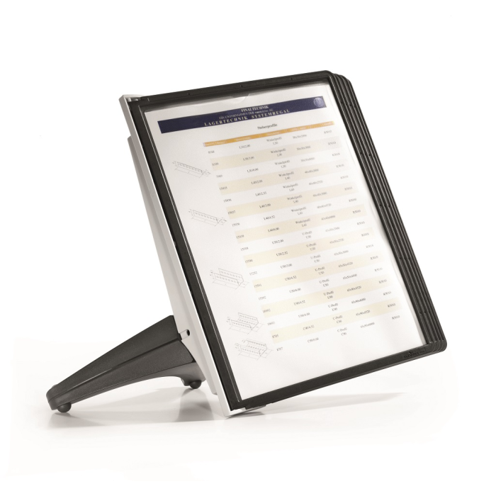 Stojan na stôl s 5 polypropylénovými displejovými panelmi formátu A4 do malých kancelárií. Stabilná základňa, systém ideálny pre užívateľov, ktorí sú obmedzení nedostatkom miesta. Farba základne i panelových rámčekov čierna.