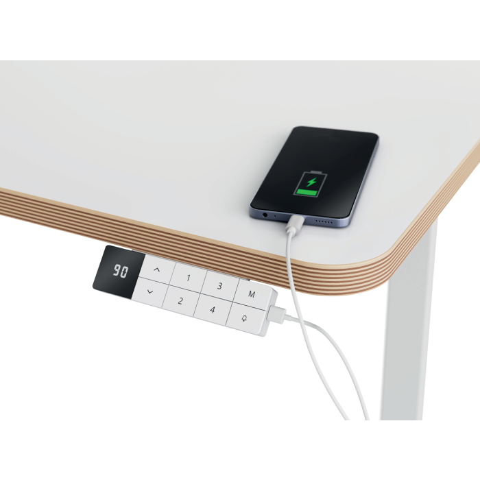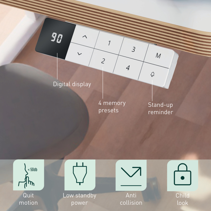 • Ovládací panel s detskou poistkou, nabíjacími portmi USB-C a USB-A, digitálnym displejom výšky, dôvtipnými pripomenutiami vstávania, ochranou proti prehriatiu a funkciou proti kolízii.