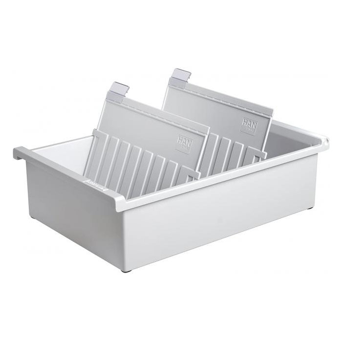 Kartotéka z antistatického nárazuvzdorného plastu na 1000 kartičiek ukladaných horizontálne. Vybavená dvoma plastovými oddeľovačmi, (inak prázdna) a ochrannými plstenými podložkami. Dodávaná bez vrchného krytu. br />Formát karty: A5