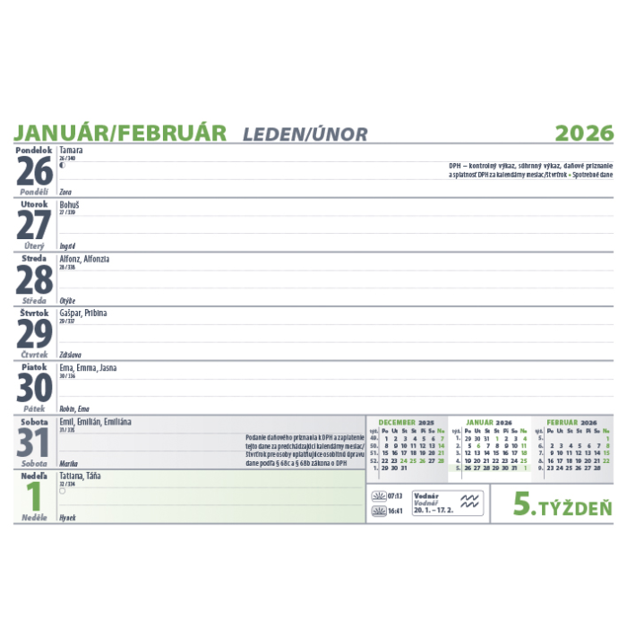 Variant pracovného kalendára s riadkovým kalendáriom. Obsah je identický s veľkým pracovným kalendárom, vrátane daňových pripomienok s prehľadnými mesačnými kalendáriami, fázami Mesiaca, východmi a západmi Slnka, štátnymi sviatkami všetkých krajín EÚ, školskými prázdninami, znameniami zverokruhu, slovenskými a českými menami (plus netradičné mená).