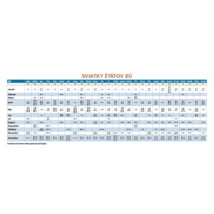 Spoznajte krásy Slovenska prostredníctvom stolového kalendára Slovensko. Týždňový stĺpcový kalendár s hodinovým delením, daňovými pripomienkami, fázami Mesiaca, východmi a západmi Slnka, štátnymi sviatkami všetkých krajín EÚ, školskými prázdninami, slovenskými a českými menami (plus netradičné mená).