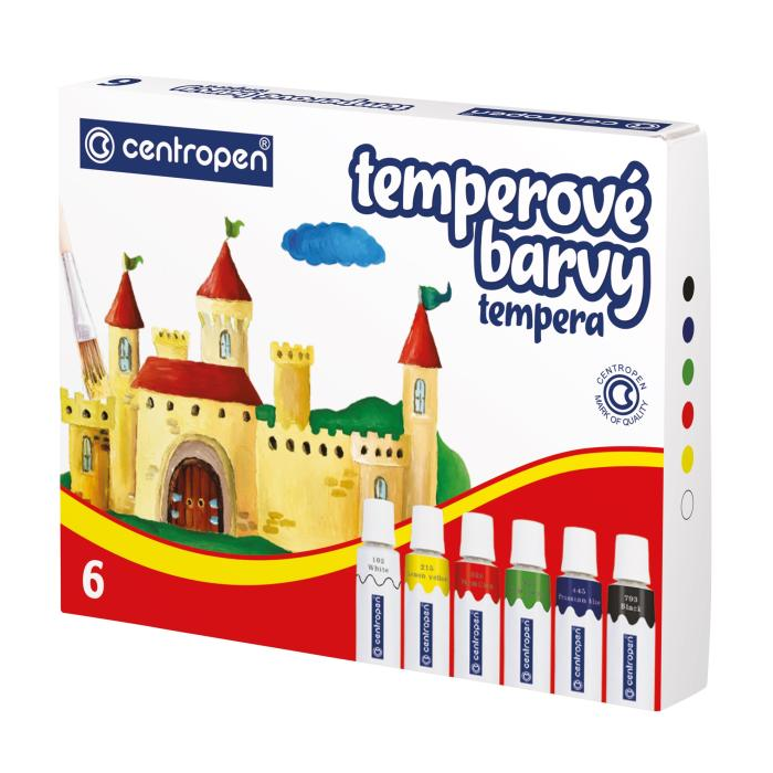 Temperové farby, 6 farieb - biela, žltá, zelená, modrá, ružová, čierna. Balenie v krabičke. Objem 1 kus/25 ml.