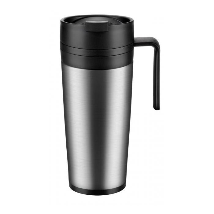 Dvojplášťový vákuový termohrnček z prvotriednej nehrdzavejúcej ocele uchová nápoje horúce aj studené. Dobre tesniaci sklápací uzáver a odnímateľná rukoväť. 5 rokov záruka. Objem 0,4 litra, Farba čierna.