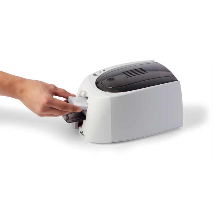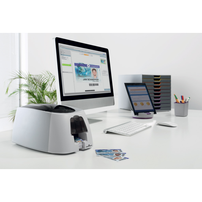 Možnosť rýchlej a jednoduchej čiernobielej alebo plnofarebnej potlače menoviek, identifi kačných, členských, vernostných a iných kariet vo fotokvalite. Karty ľahko vytvoríte pomocou voľne dostupného softvéru DURAPRINT® na PC aj MAC na www.duraprint.eu. Balenie obsahuje tlačiareň, farebnú pásku a 100 plastových kariet rozmerov 53,98 × 86,60 mm, príručku, napájací kábel, zdroj a USB kábel.