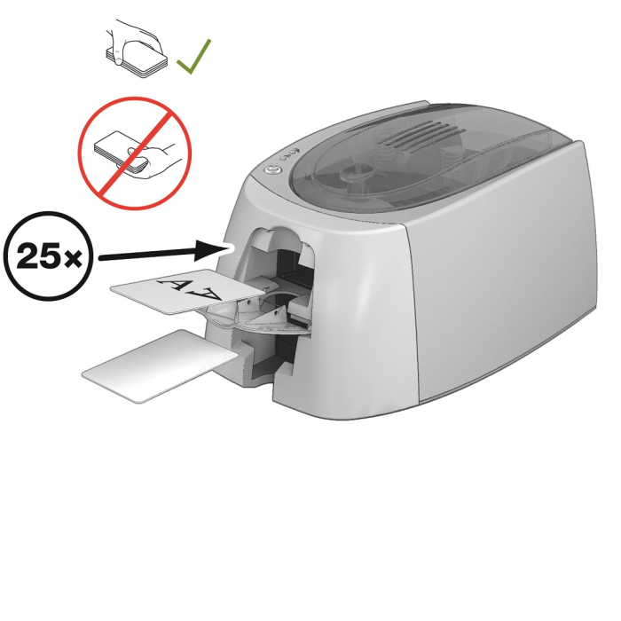 Rýchlosť tlače vo farbe YMCK je 95 kariet za hodinu, jednofarebná tlač je 240 kariet za hodinu.