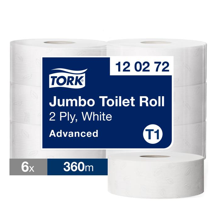 Tork Jumbo systém je časovo efektívny a znižuje náklady, ponúka oveľa väčšie množstvo toaletného papiera ako štandardný kotúč. Tork Jumbo toaletný papier v kotúči Advanced dvojvrstvový výborne vyvažuje náklady a množstvo je ideálny pre vysoko frekventované prostredia. V predaji po balení (6 roliek).