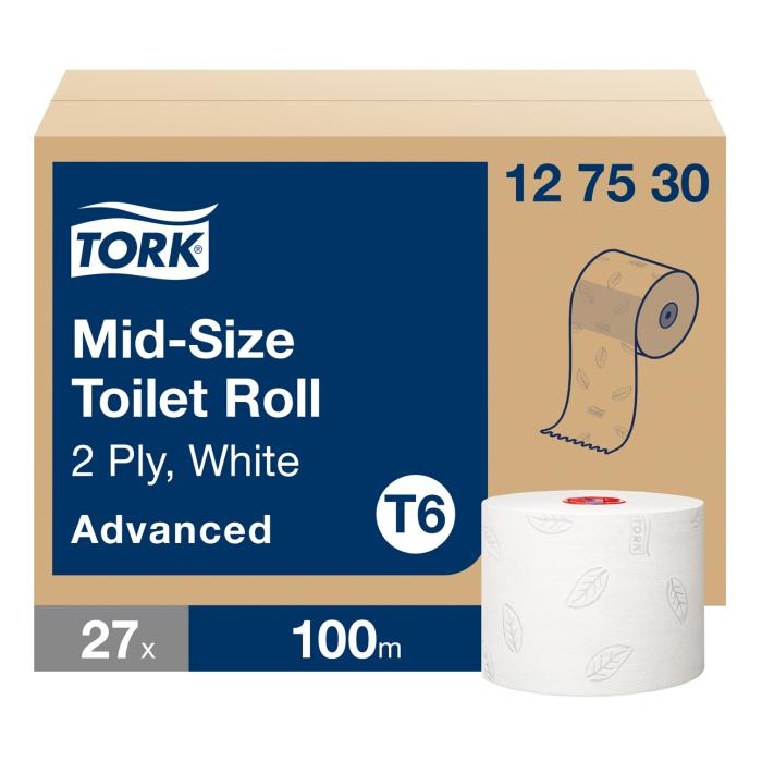 Dvojvrstvový biely toaletný papier z celulózy do zásobníkov Tork Mid-size, balený v kartóne po 27 ks. Dĺžka kotúča 100 m, priemer kotúča 13,2 cm.