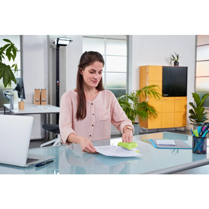 Veľkokapacitná dierovačka s aretáciou horného dielu na ľahké uloženie a posuvným pravítkom. Rozpätie dier 8 cm. Hmotnosť 790 g. Záruka 10 rokov.