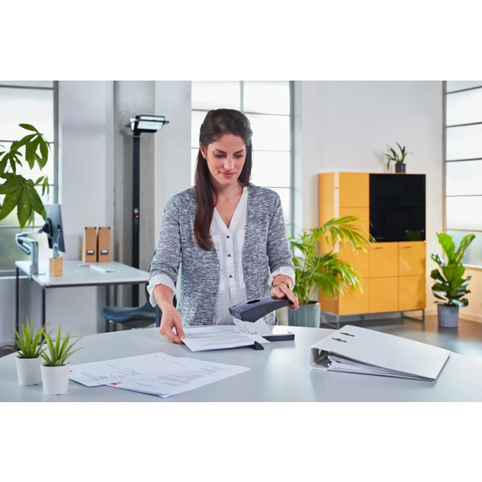 Veľkokapacitná dierovačka s aretáciou horného dielu na ľahké uloženie a posuvným pravítkom. Rozpätie dier 8 cm. Hmotnosť 970 g. Záruka 10 rokov. Výsekové hlavy je doporučené pravidelne premazávať.