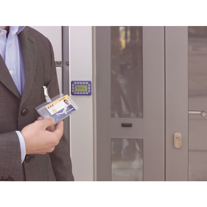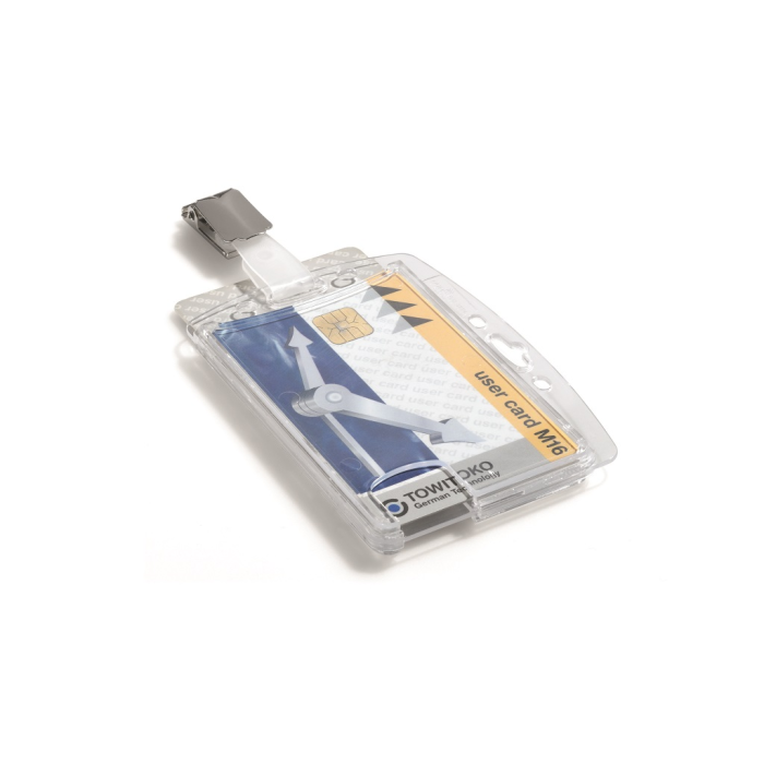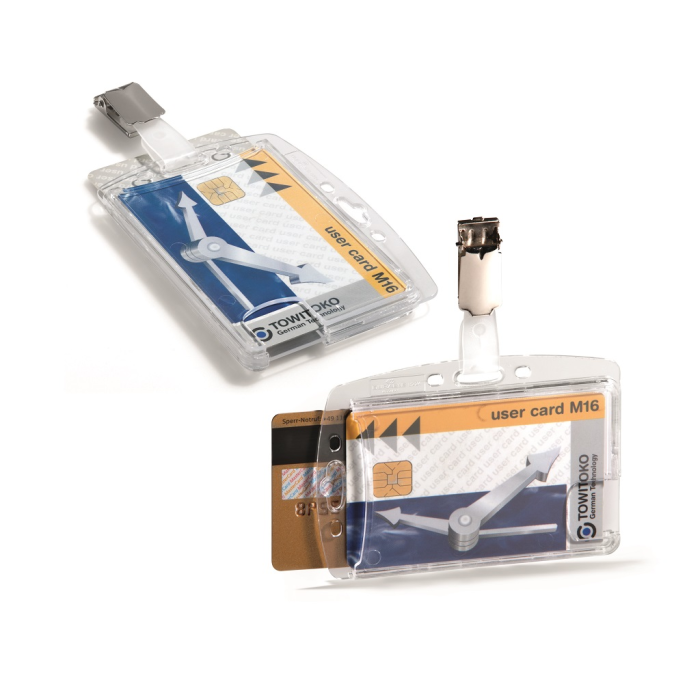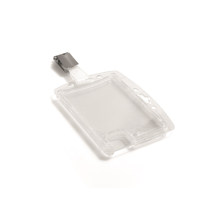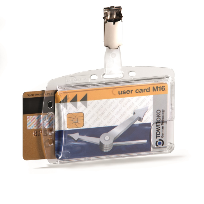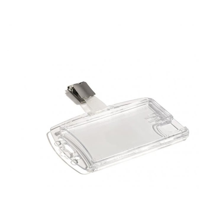 Visačka na dve plastové karty zo silného priehľadného nepružného plastu, chrániace karty z oboch strán. Vkladanie kariet po kratšej strane. Možnosť použitia horizontálne aj vertikálne. Uchytenie štipcom. Balenie 25 ks.