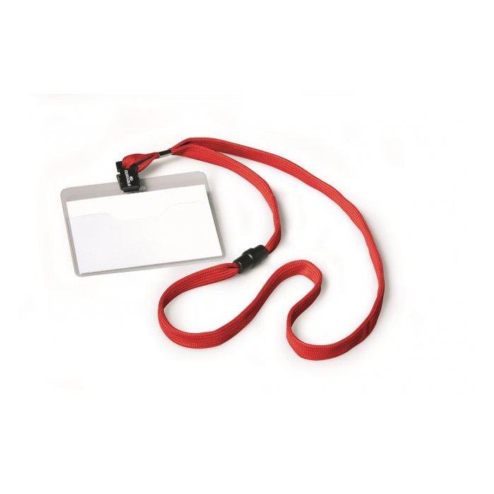 Visačka na krk s farebným bezpečnostným remienkom dĺžky 44 cm. Poistka na remienku sa uvoľní pri zachytení remienka alebo silnom potiahnutí. Materiál pevné priehľadné PVC, závesný remienok šírky 10 mm. Balenie 10 ks. Náhradné papieriky DU145602.