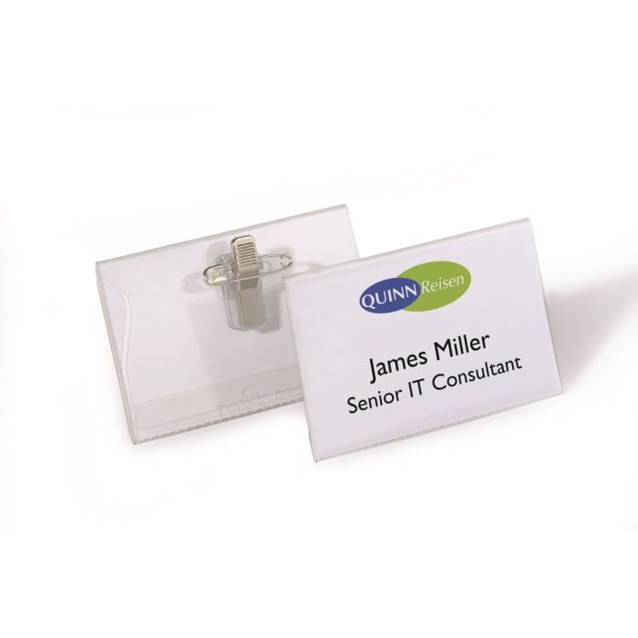 Visačka z pevného priehľadného PVC. Uchytenie na odev pomocou štipca alebo zatváracieho špendlíka. V balení 5 ks. Rozmery: 90 x 54 mm.
