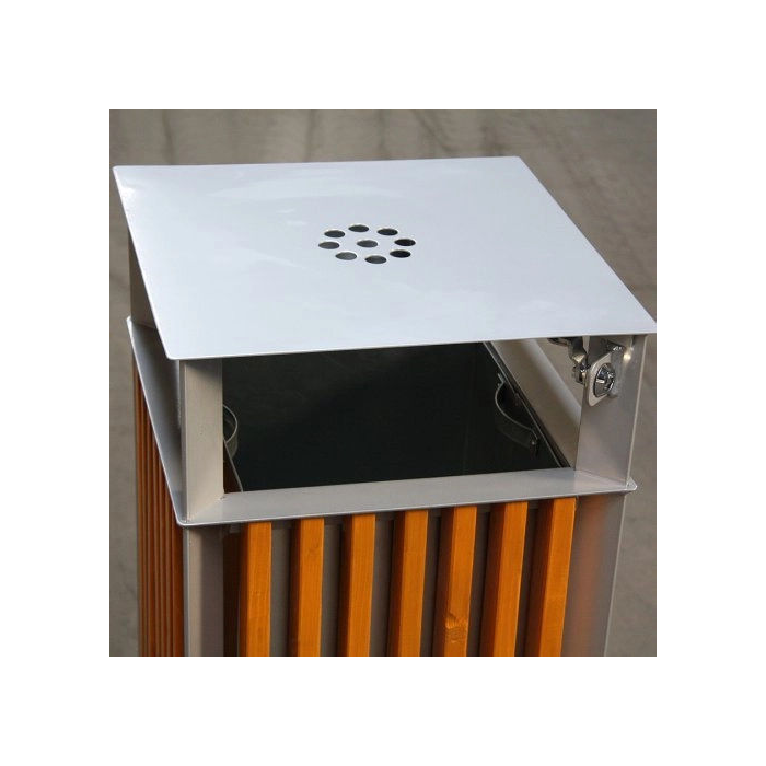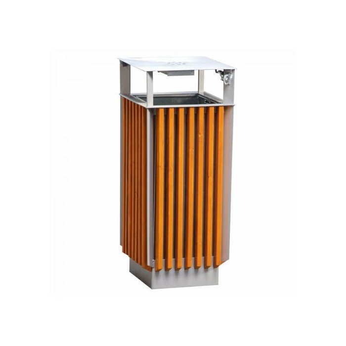 Moderný drevený odpadkový kôš s popolníkom vhodný na záhradu ale aj na mestské námestie.