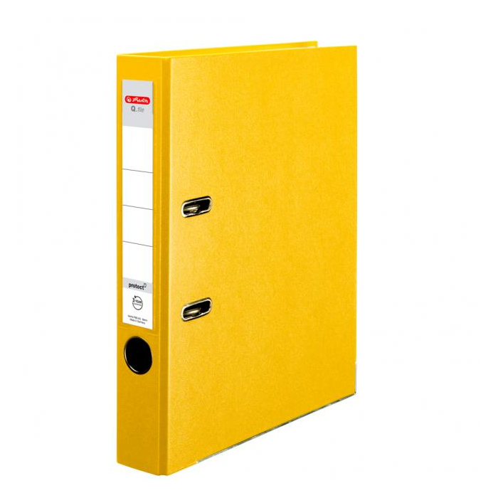 Pákový zakladač Q.file protect formátu A4. Šírka chrbta 5 cm. Materiál polypropylén, zásuvné vrecko, vnútorný biely podlep, lepenka 2mm, otvor na zadnej strane a radokrúžok pre lepšiu manipuláciu, kovová lišta. Farba žltá. Balenie 25 ks.