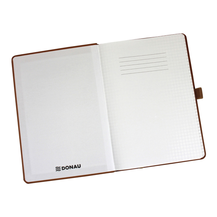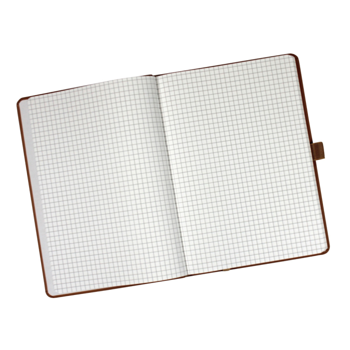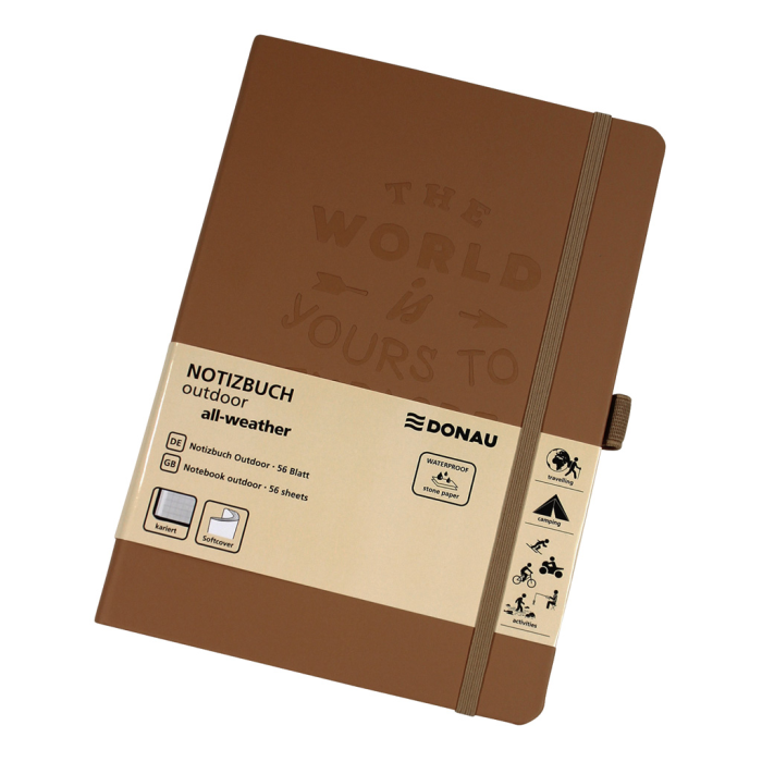 Zápisník outdoorový A5, štvorčekový. Vodoodolný obal s dizajnovým razením, 56 listov vodoodpudivého papiera, 120 g/m². S pútkom na pero, gumičkou a archívnym vreckom. Farba hnedá.