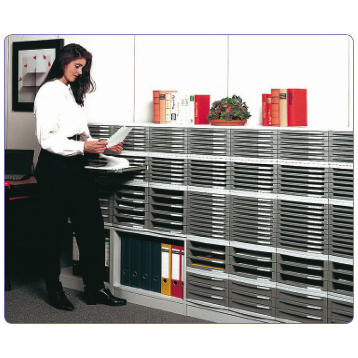 Box z modulárneho systému zásuvkových boxov s horizontálnym aj vertikálnym spájaním. Model so zatvorenými zásuvkami výšky 50 mm a zarážkou chrániacou zásuvky pred úplným vysunutím. Súčasťou sú identifikačné menovky na označenie zásuviek.Telo boxov vo svetlosivej farbe, zásuvky tmavosivé. Rozmery (š × v × h) 30 × 30,7 × 38,2 cm.