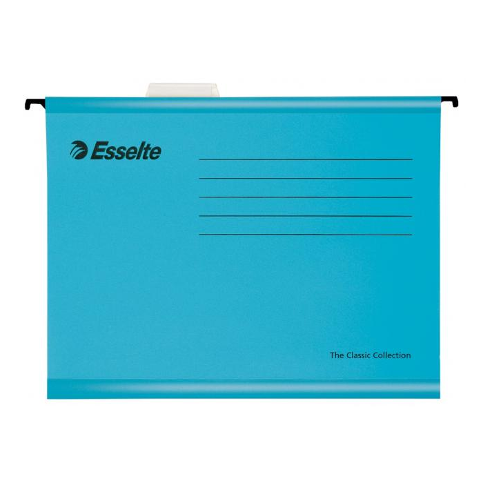 Závesné obaly Esselte kolekcie Classic vyrobené z pevného kartónu. Lisované dno obalu dovoľuje zvýšiť kapacitu na 30 mm. Súčasťou obalu je násuvný index z priehľadného plastu s výmenným papierovým štítkom. Formát A4, rozpätie vodiacich líšt 330 mm.