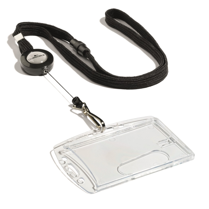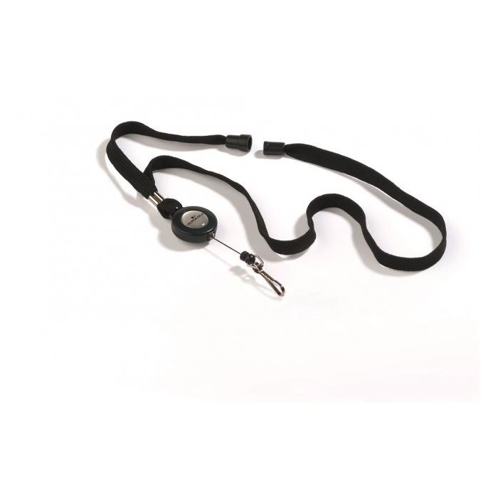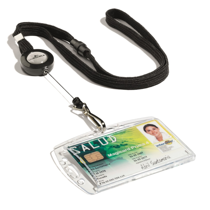 Kombinácia výsuvného kotúča a remienka na krk šírky 10 mm s bezpečnostnou poistkou, ktorá sa uvoľní pri zachytení remienka alebo pri silnom potiahnutí. Vďaka tomuto spôsobu uchytenia je možné s kartou pohodlne manipulovať. Vysunutie kotúča do 80 cm, remienok dĺžky 44 cm. Balenie 10 ks.