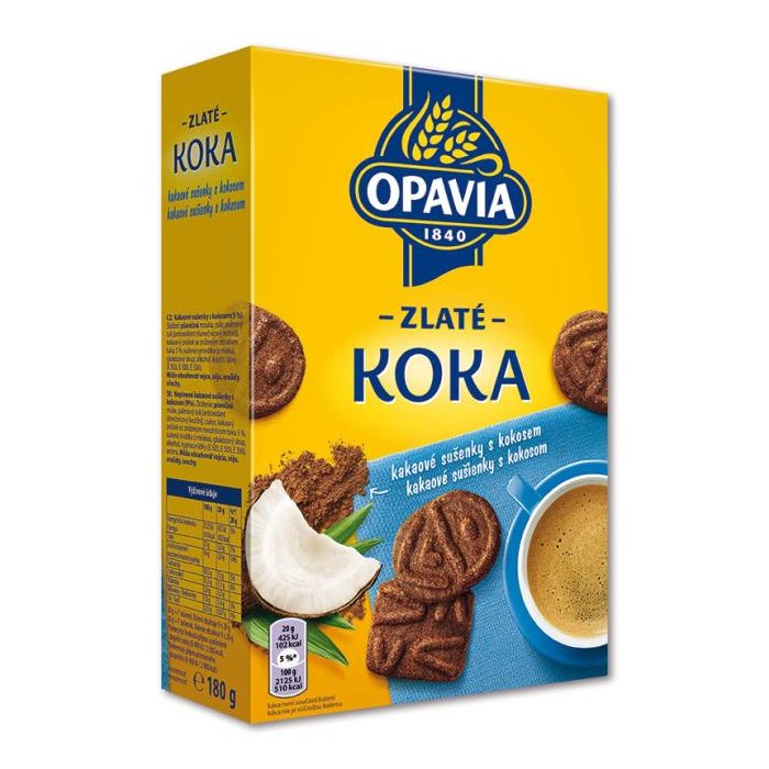 Zloženie: PŠENIČNÁ múka, cukor, palmový tuk, strúhaný kokos 9%, kakaový prášok so zníženým množstvom tuku 5,5 %, PŠENIČNÝ škrob, sušené VAJCIA, alkohol, kypriace látky (E503, E500, E336), aróma. Môže obsahovať MLIEKO a ORECHY.