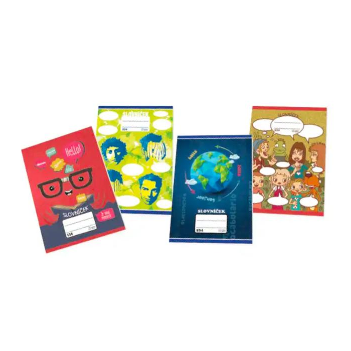 30 listový zošit na slovíčka pre deti aj dospelých. Formát A5, linky 8 mm a 2 kolmice pre cudzojazyčné slovo, jeho výslovnosť a preklad vhodné pri výučbe akéhokoľvek cudzieho jazyka. Školské zošity sú vyrobené z kvalitného bezdrevného zošitového papiera. Obálka: obojstranne natieraný ofsetový papier s detským motívom a motívom pre dospelých.