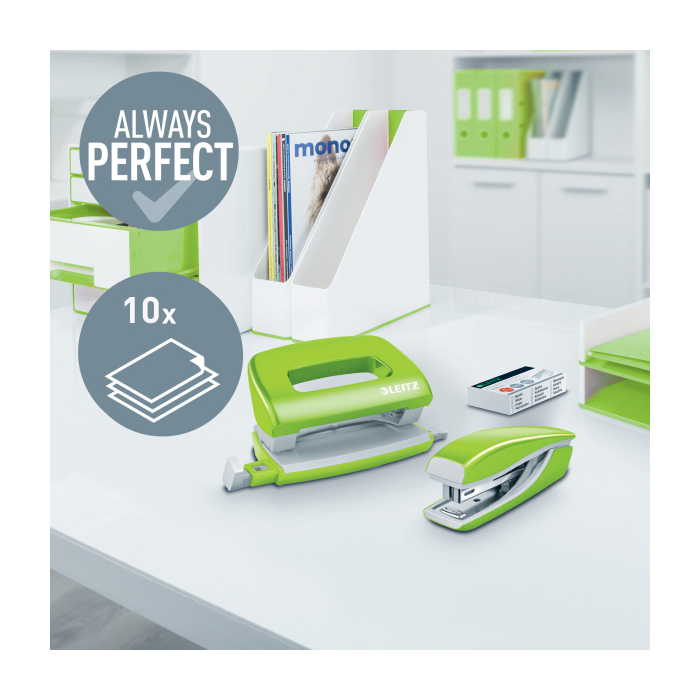 Malá zošívačka v moderných žiarivých farbách ideálna nielen do kancelárie, ale aj domov alebo na cesty. Vždy perfektné zošitie vďaka patentovanej technológii DIT. V kombinácii so spinkami Leitz Power Performance P2 (č. 10) dosiahnete vždy jednoduché a správne zošitie.Kapacita 10 hárkov. Vrecková zošívačka. Patentovaná technológia DIT na spoľahlivé zošívanie. Balenie v škatuľke, vrátane spiniek. Otvorením ramena o 180° je možné použiť nástenkové zošívanie (takrovanie). Farba zelená.