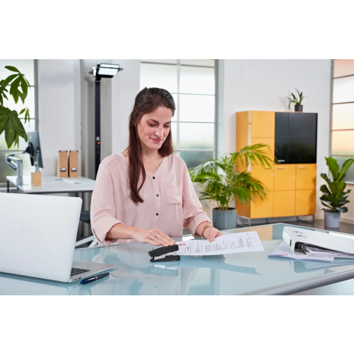 Malá ľahká zošívačka so systémom plochého zošívania (Flat-Clinch), umožňujúca superľahké zošívanie. Plastový zásobník, jednoduché vedenie spiniek. Kapacita náplne 100 spiniek veľkosti  10. Hĺbka zošívania 3,8 cm. Hmotnosť 115 g. Záruka 10 rokov.