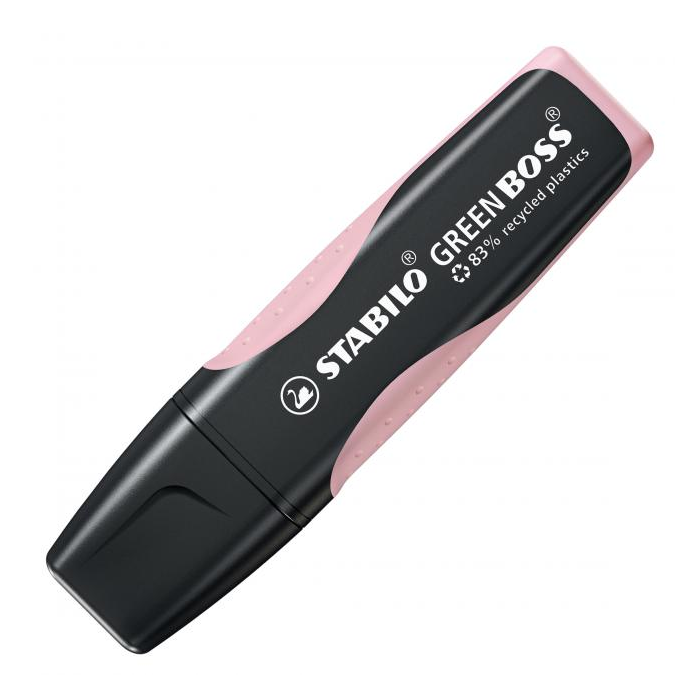 STABILO GREEN BOSS je zvýrazňovač vyrobený z 83% recyklovaného plastu pre školákov, študentov, učiteľov a kancelárskych pracovníkov, ktorí sú ohľaduplní k životnému prostrediu. Ekologický zvýrazňovač je k dispozícii v trendových pastelových a svetlých farbách! Technológia STABILO Anti-Dry-Out chráni pred vysychaním po dobu 4 hodín a zaisťuje koncentrovanú prácu. Značkuje a podčiarkuje v dvoch šírkach stopy 2 a 5 mm. Vďaka protišmykovej zóne úchopu leží bezpečne v ruke. Farba pastelová ružová. Väčšie balenie 10 kusov.